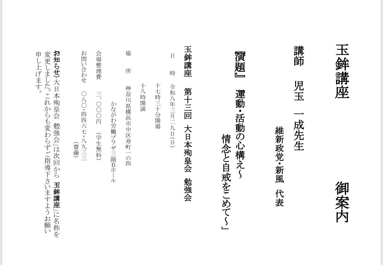 日時 令和八年三月廿九日(日) 十七時三十分開場 十八時〇〇分開演講師 児玉一成先生(維新政党・新風代表)演題 運動・活動の心構へ 〜情念と自戒をこめて〜會場 かながわ労働プラザ三階Bホール住所 神奈川縣橫濱市中區壽町一丁目四番地